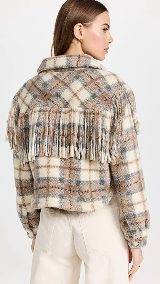 Bringing a touch of playful texture to your transitional wardrobe, this BLANKNYC jacket updates the of-the-moment shirt jacket silhouette with fuzzy felt, western-inspired fringe, and a cropped, boxy cut.