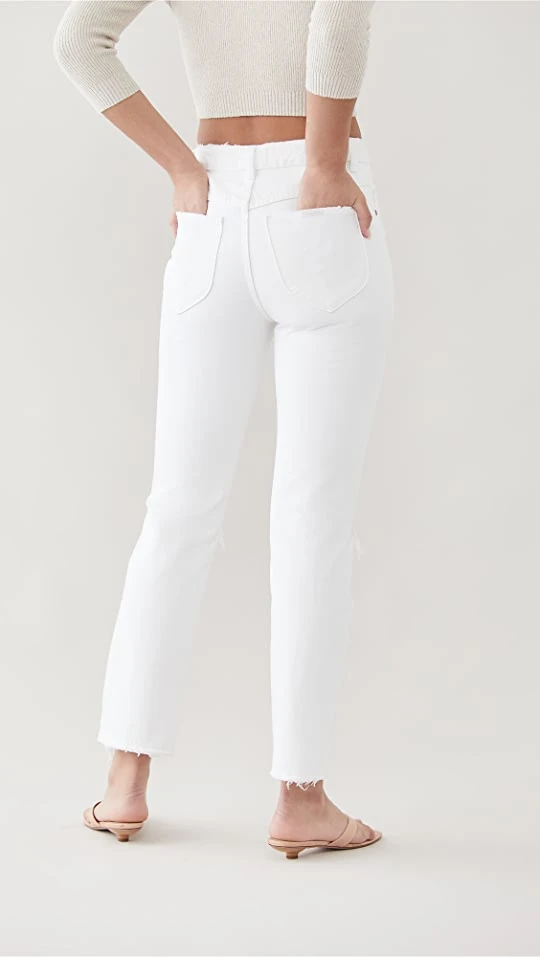 Crisp white denim and distressed detailing make for a chilled-out pair of Rolla’s jeans that you can wear all summer long. They are designed with a high-waisted silhouette, making them perfect for crop tops and tucked-in tanks.