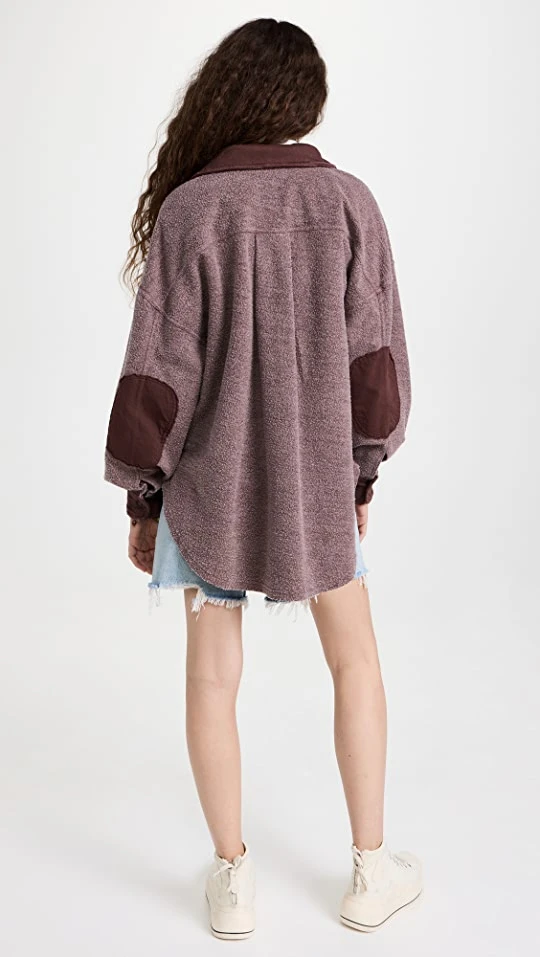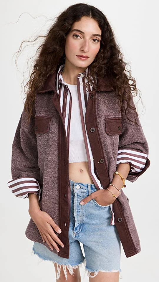 Made of fuzzy fleece and featuring contrast trim, this perfectly oversized jacket from Free People is styled to resemble an oversized button down shirt and is a great layer for throwing on when temps start to drop.